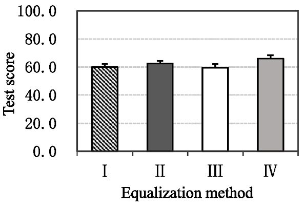 客觀指標表明,相比于幅度均衡,相位均衡對耳機瞬態(tài)響應(yīng)的影響更大,尤其當(dāng)系統(tǒng)相位為線性時,瞬態(tài)響應(yīng)衰減更快。圖中表示四種方法均衡后的主觀測聽效果。四種方法分別為幅度相位不均衡(I)、幅度相位同時均衡(II)、只均衡幅度(III)、只均衡相位(IV)。主觀評價實驗結(jié)果表明,線性相位對耳機重放音色的提升顯著,而以平直幅頻響應(yīng)為目標的幅度均衡對耳機重放音色提升有限。因此,耳機均衡時不僅需要設(shè)計合適的幅頻響應(yīng)目標,還要考慮相位均衡對耳機重放的影響。